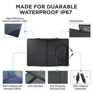 WATERPROOF & DURABLE The EcoFlow 60W Solar Panel is fully waterproof due to a seamless, one-piece design, making it ideal for outdoor activities like camping and hiking. An ETFE film provides extra protection against ultraviolet light, prolonging the lifespan of the product.