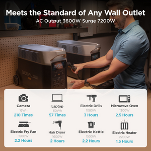 A single DELTA Pro unit packs a 3600W AC output, which can be expanded up to 4500W with X-Boost technology. Power 99.99% heavy-duty devices at home, outdoors, or at work.