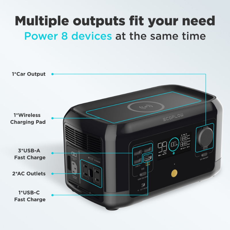 - All the ports needed - RIVER mini has all the ports & outlets you’d ever need. 2 AC wall outlets, 1 DC car outlet, 3 USB-A ports and a USB-C fast-charge port. It even has a wireless charging pad up top. With all that, you can power up to 8 devices at once.