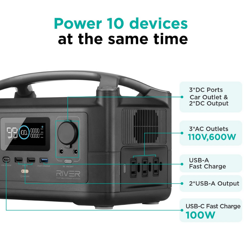 Power a Wide Range of Devices - The RIVER comes with three AC outlets. (Note that the total rated wattage of the three AC outlets is 600W (surge 1200W)). With a built-in 600W inverter, the RIVER can power devices up to 1800W with the X-Boost mode on. This provides support for a wide range of essential devices such as a fridge, TV, laptop, hairdryer, and more.