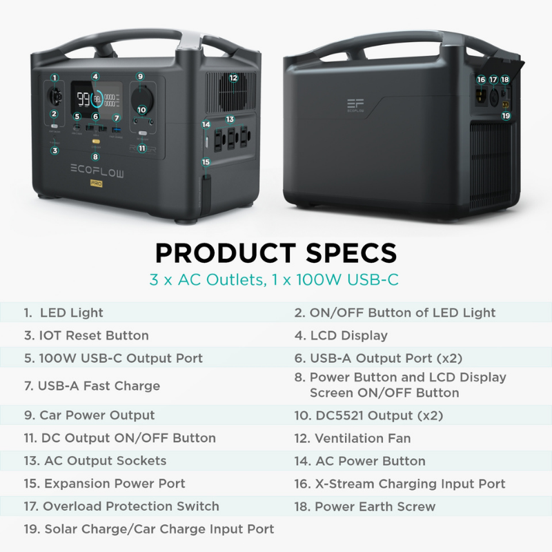 - 3 x 600W AC OUTLETS AND 720Wh CAPACITY The RIVER Pro can power up to 10 devices simultaneously with multiple outlet options, including 3 pure sine wave AC outlets. It offers up to 720Wh power, and it weighs just 15.9lbs, which makes it a portable power source for adventure on the go.