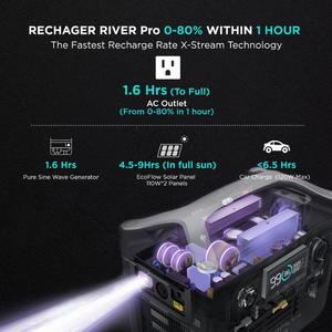 - RECHARGE FROM 0-80% WITHIN 1 HOUR The patented EcoFlow X-Stream technology enables you to charge the RIVER Pro from 0%-80% within one hour and offers a full charge in just 1.6 hours.
