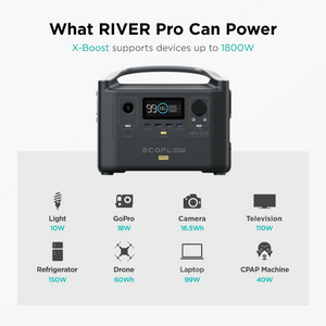 - POWER A WIDE RANGE OF APPLIANCES The RIVER Pro can power some devices up to 1800W with the X-Boost mode on, which lets you power about 80% of essential devices like kitchen appliances and DIY tools. Use devices below 1200W for the best product use.