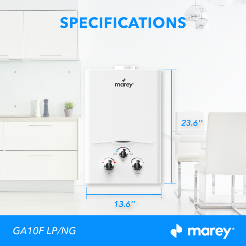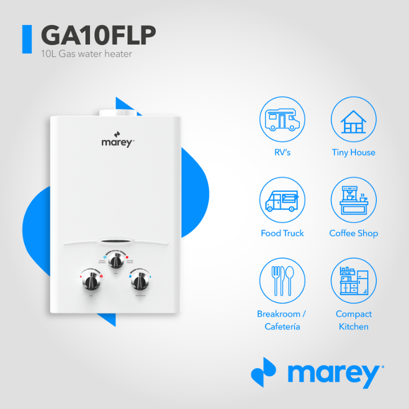 The compact design of the Marey Gas 10L Liquid Propane Tankless Water Heater saves space and is easy to install almost anywhere, Provide endless hot water on demand and only as needed.