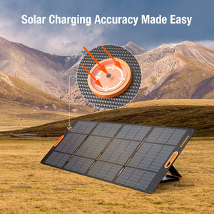 - The solar panel features a solar angle indicator to help you charge more accurately. Simply align your solar panel to the sun's rays using the shadow as a guide. When the shadow is lined up to the center of the indicator, a maximum conversion rate is achieved.