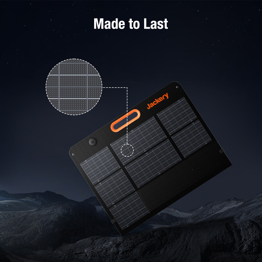 - The solar panel has been built with durability in mind. It is made from water-proof ETFE materials and the robust frame provides added protection from sudden drops. The laminated craftwork ensures solar cells are sealed tightly for enhanced longevity.