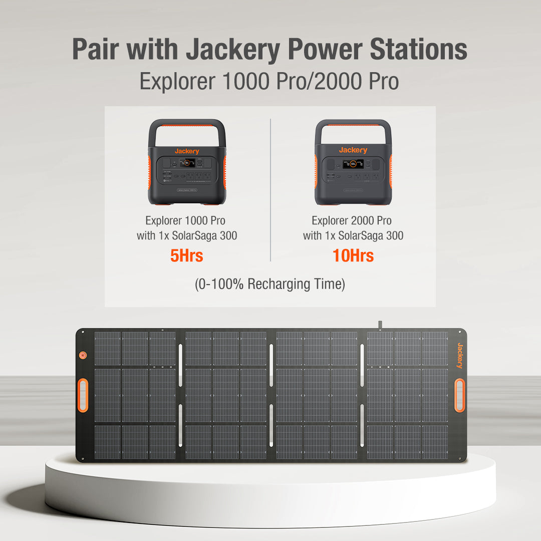 - The SolarSaga 300 is compatible with Jackery power stations (Explorer 1000 Pro/2000 Pro). These power station models support 2 panels at the same time for increased charging performance.