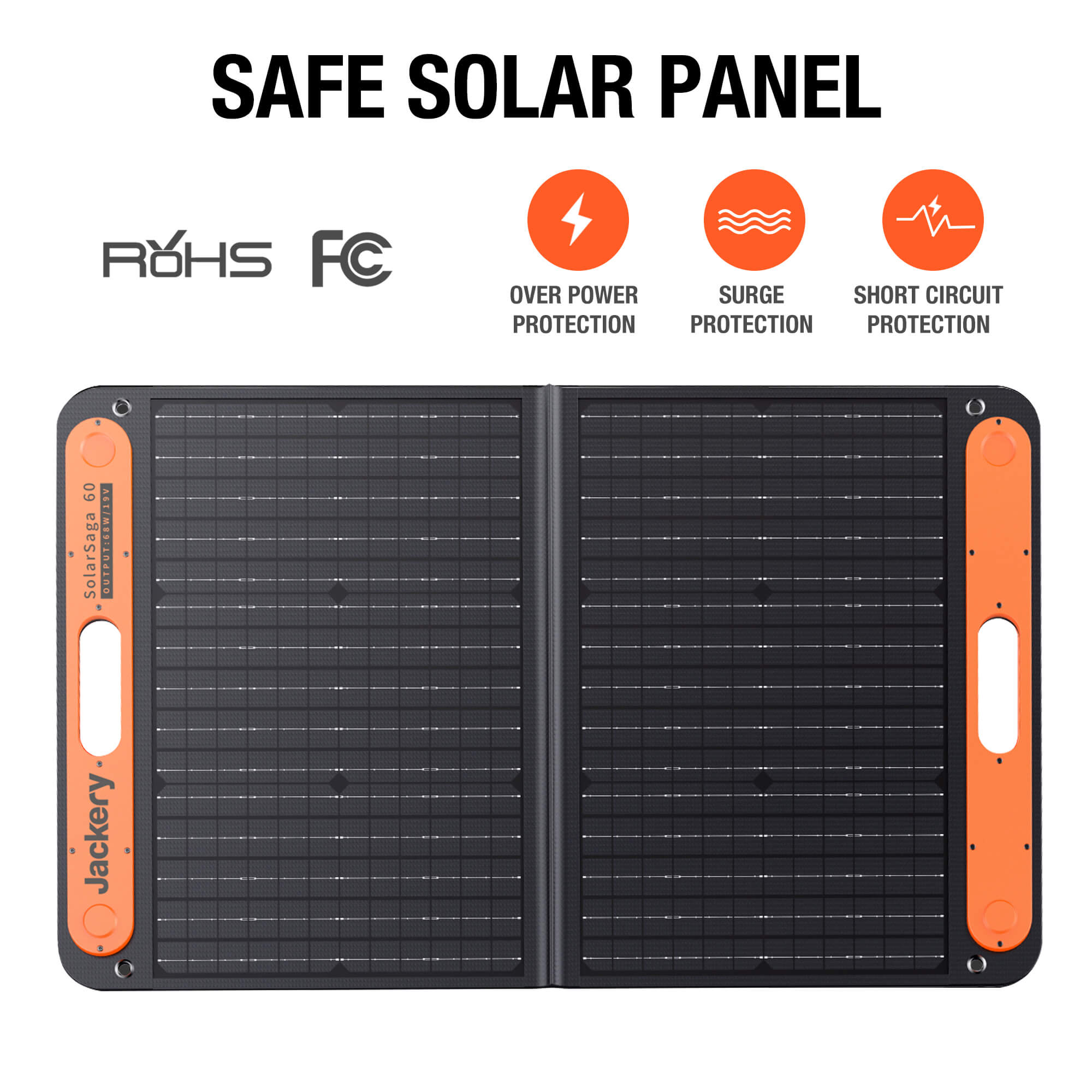 - Compatible with Jackery Explorers: It takes 4.5hrs and 6.5hrs to charge Jackery Explorer 160 and Explorer 240 with Solar Saga 60. This portable solar panel is also equipped with 1* USB-C and 1* USB-A port that allows you to charge up to 2 devices at once.